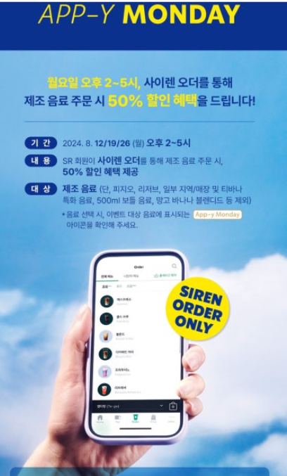 8월 한 달, 3주간 매주 월요일 오후 2~5시 사이 사이렌오더를 통해 제조음료 주문 시 50% 할인 (8월 12일, 19일, 26일)을 받을 수 있습니다. 사이렌오더 1회 최대 6개 아이템이 가능하고 텀블러 할인이나 에코별 적립 가능도 가능합니다.