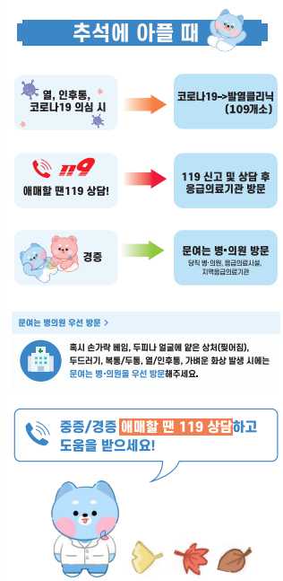 그리고 미리 우리 동네 추석연휴에 비상진료를 하는 의원과 약국도 미리 알아두셔서 급할 때 빠른 대처 하시기 바라겠습니다.